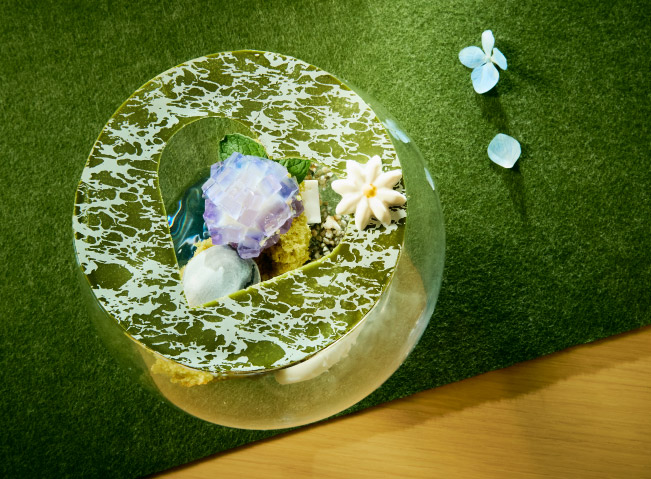 猪目窓から見える正寿院ウェルカムデセールハート型の猪目窓から望むアジサイが咲く新緑の庭をデセールに。食べるのが勿体なくなるような可愛らしいスイーツテラリウム。