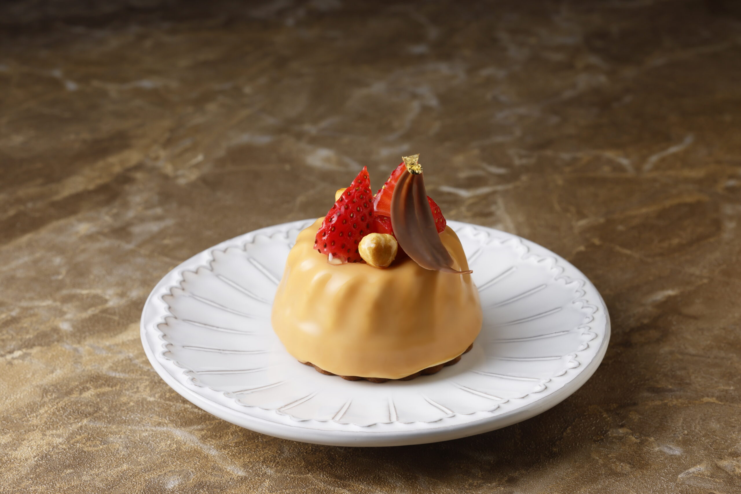 中心に流し込んだいちごのソースとヘーゼルナッツキャラメリゼの食感をお楽しみください。