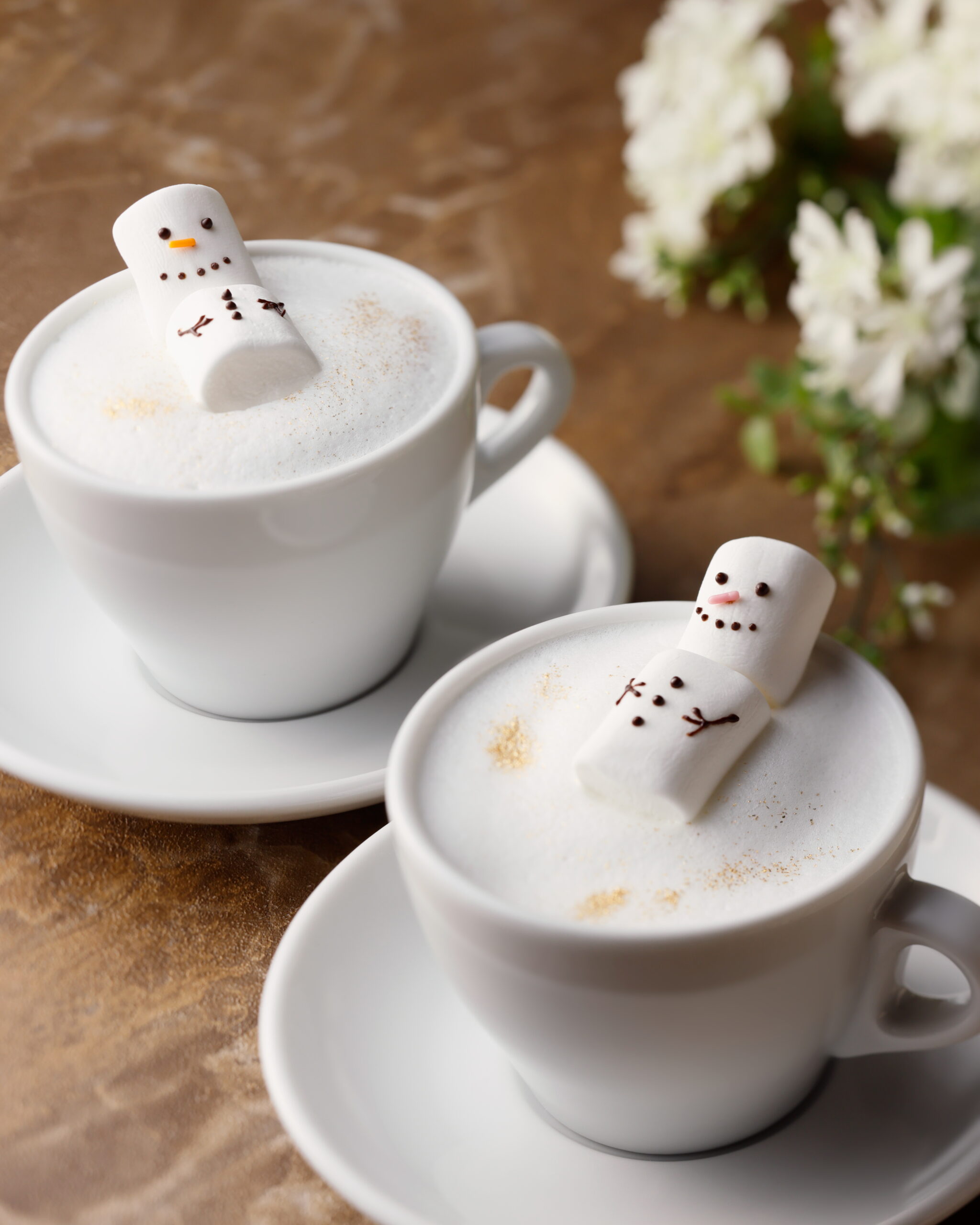 可愛らしい雪だるまのマシュマロがのったラテマキアート。