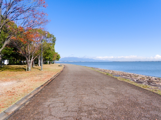 琵琶湖ホテルから徒歩圏内に広がる湖畔のプロムナード。 冬のなぎさ公園は人も少なく、静かな水面と柔らかな光が穏やかな時間をつくります。 朝は澄んだ空と湖面が鏡のように輝き、夕方にはオレンジ色の光が水面に揺らめく幻想的な景色をお楽しみいただけます。