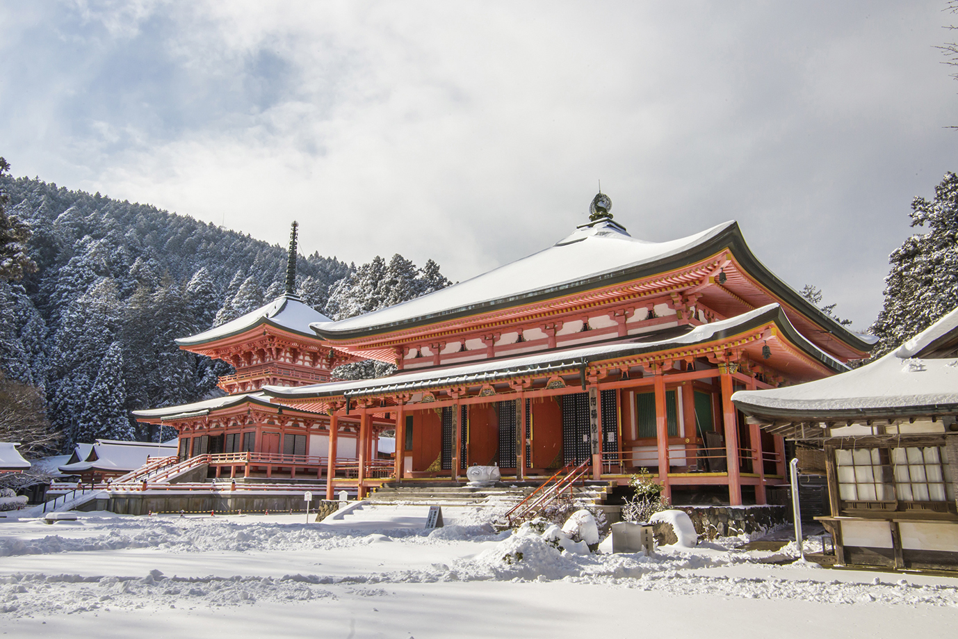 世界文化遺産にも登録される「比叡山延暦寺」。雪をまとった伽藍は一層厳かな雰囲気に包まれ、静かに歩くだけでも心が整います。ロープウェイやドライブウェイを利用して、冬ならではの凛とした山の空気を感じてみてください。参拝のあとは、山頂から望むびわ湖の眺めもぜひお楽しみください。