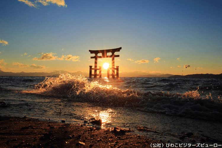 びわ湖の湖上に鳥居が浮かぶ景観で知られる「白鬚神社」。冬の凛とした空気の中で見る朝焼けや夕暮れの鳥居は、どこか神秘的です。湖岸道路沿いにあり、ドライブの途中に立ち寄って、安全祈願や旅の思い出づくりをするのにもおすすめ。カメラを向けたくなるフォトジェニックなスポットとしても人気を集めています。
