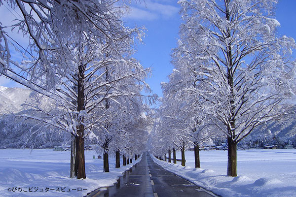 まっすぐに延びる約500本のメタセコイヤがつくる並木道は、冬になると枝先まで白く雪化粧し、幻想的な世界に。静かな農村風景と相まって、写真映えするスポットとしても人気です。ドライブコースとしても定番で、季節ごとに表情の変わる並木道を楽しめます。びわ湖の観光と組み合わせて、少し足を延ばして訪れてみてはいかがでしょうか。