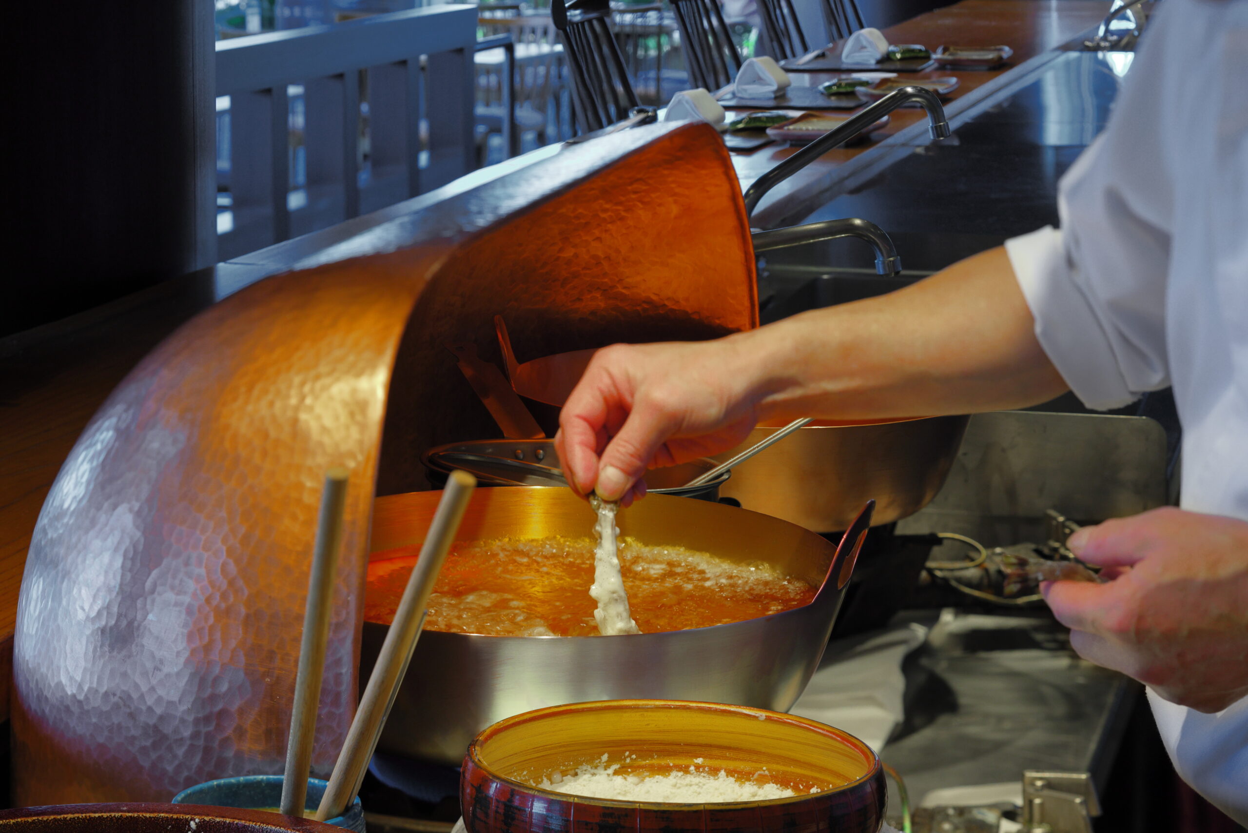 びわ湖で獲れた魚や滋賀県産野菜、近江牛などを使い、“湖国の恵み”を味わえる天麩羅会席です。目の前のカウンターで職人が揚げる揚げたての天麩羅とソムリエがセレクトしたワインのペアリングコースをお楽しみください。