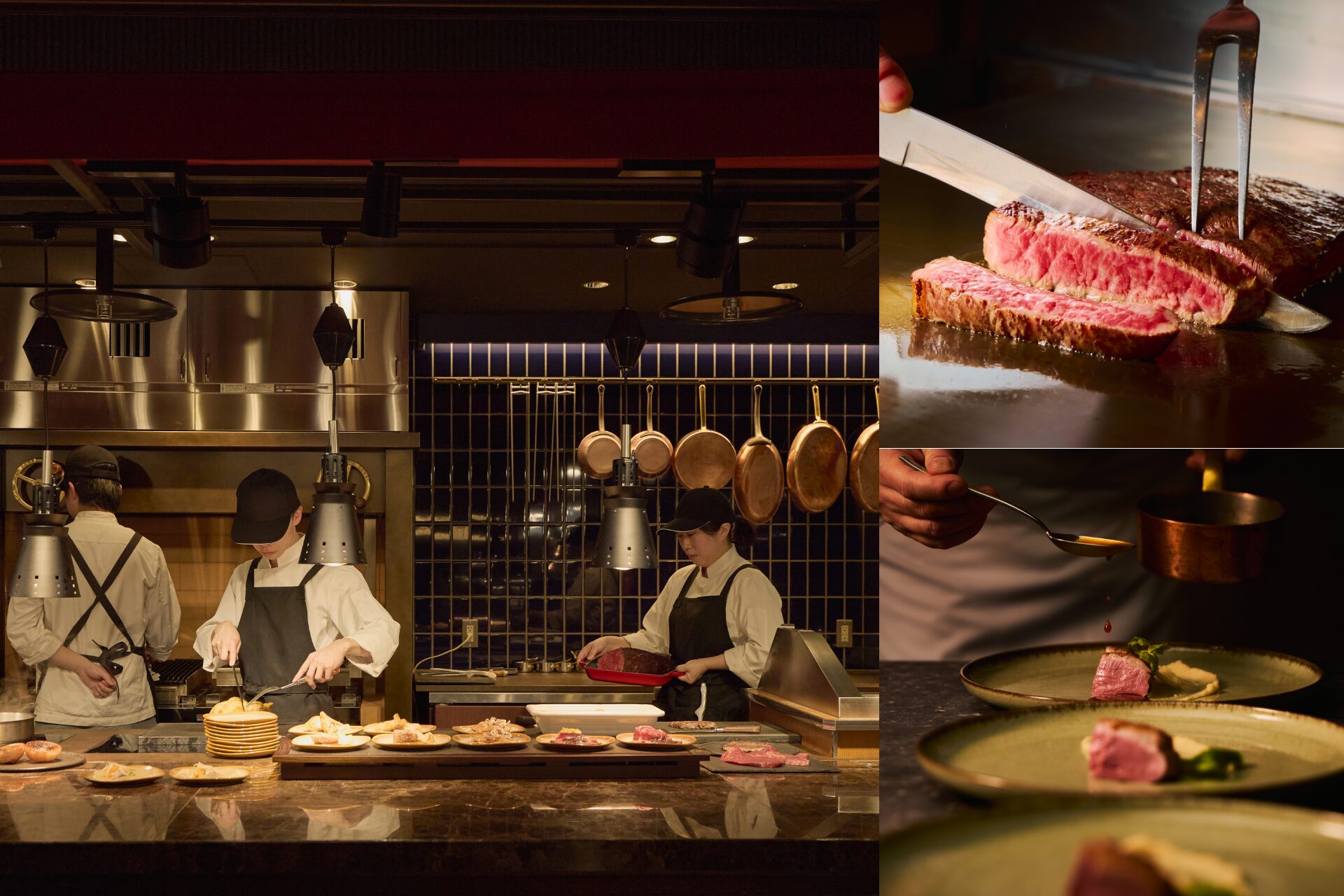 パフォーマンスコーナー「MEAT THEATER」では、ランチ・ディナーとともに和牛を使用したメニューをはじめ、多彩な調理で仕上げる肉料理が30分間隔で登場。