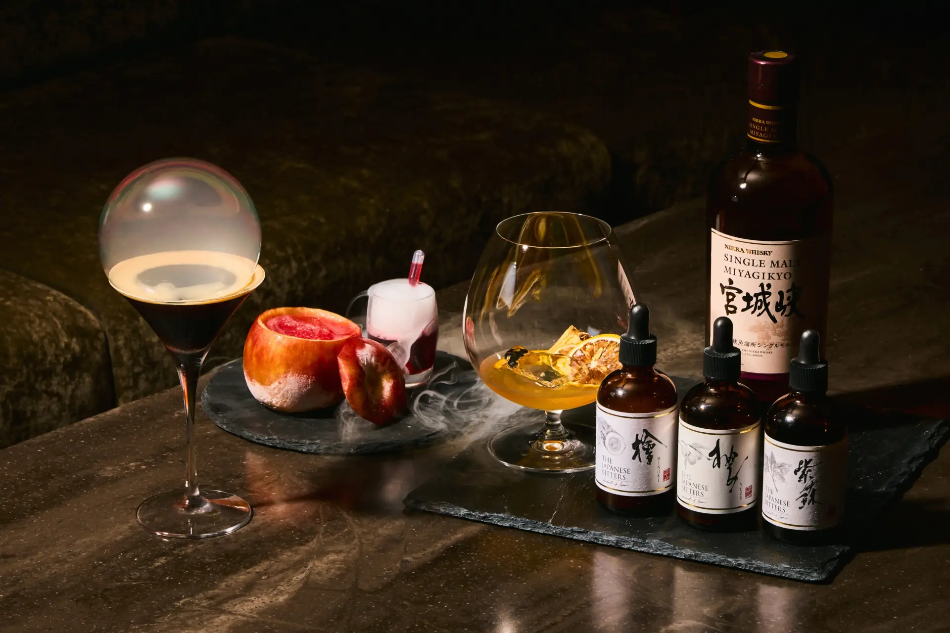 ジャパニーズウイスキー「宮城峡」をベースに、自家製ドライフルーツを添えた一杯。