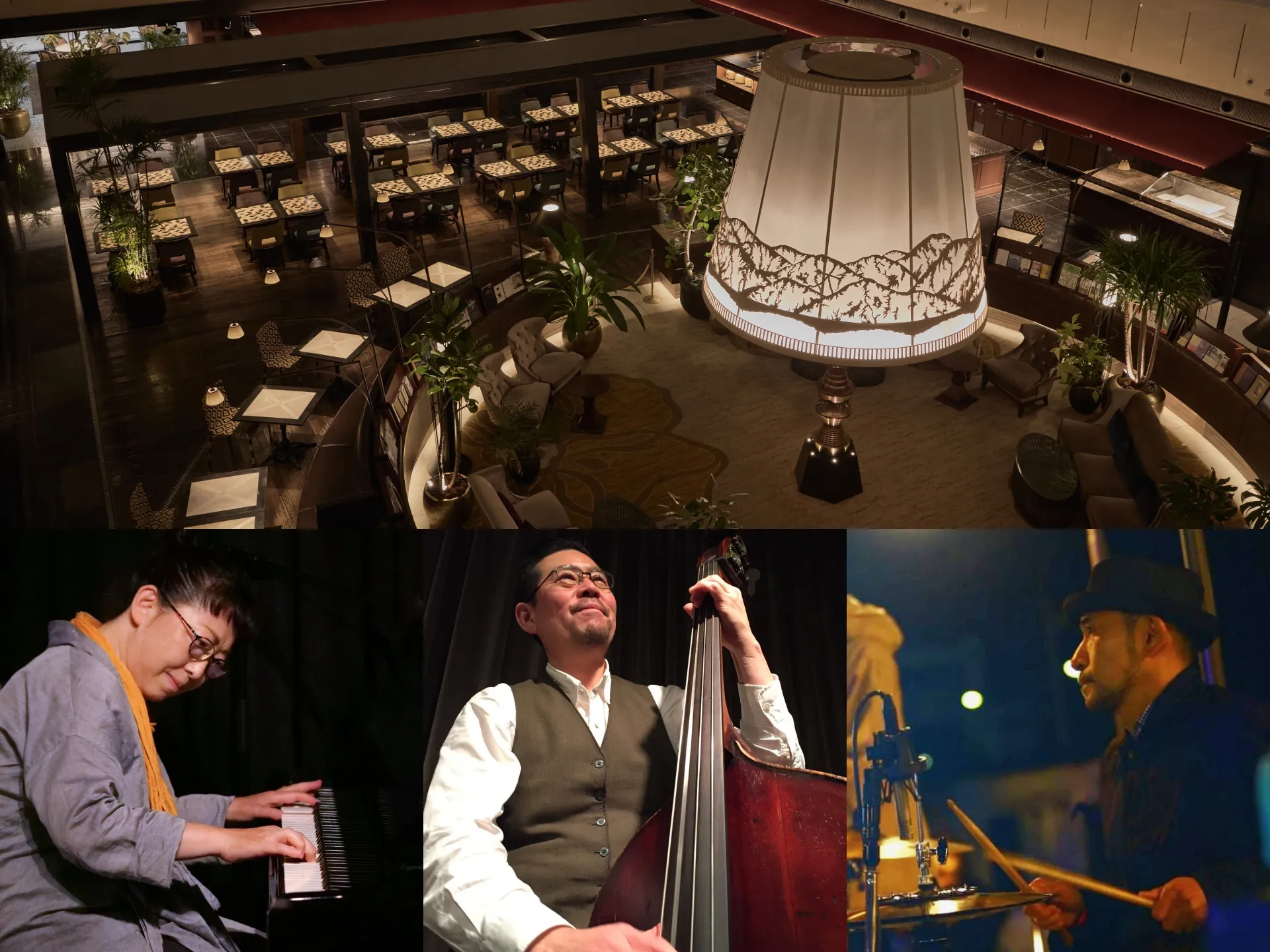 この度の改装でも継承したホテルのシンボルである、世界最大級の高さ4m80cmを誇るフロアスタンド「かんじんの京灯り」を中心に広がるノスタルジックなロビー空間にて、創業98周年の感謝を込めてジャズの生演奏プログラムを開催いたします。