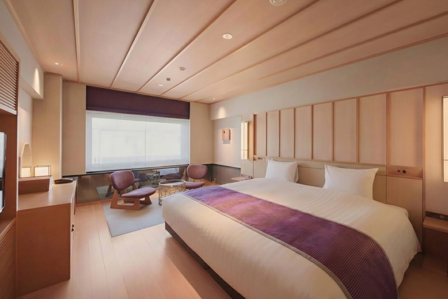 低めに配置されたベッドをはじめとする家具が空間にゆとりある余白を生み出し、日本の建築空間が持つ独特の落ち着きを演出します。京都の歴史に身を委ねるような、穏やかな休息をお楽しみください。
