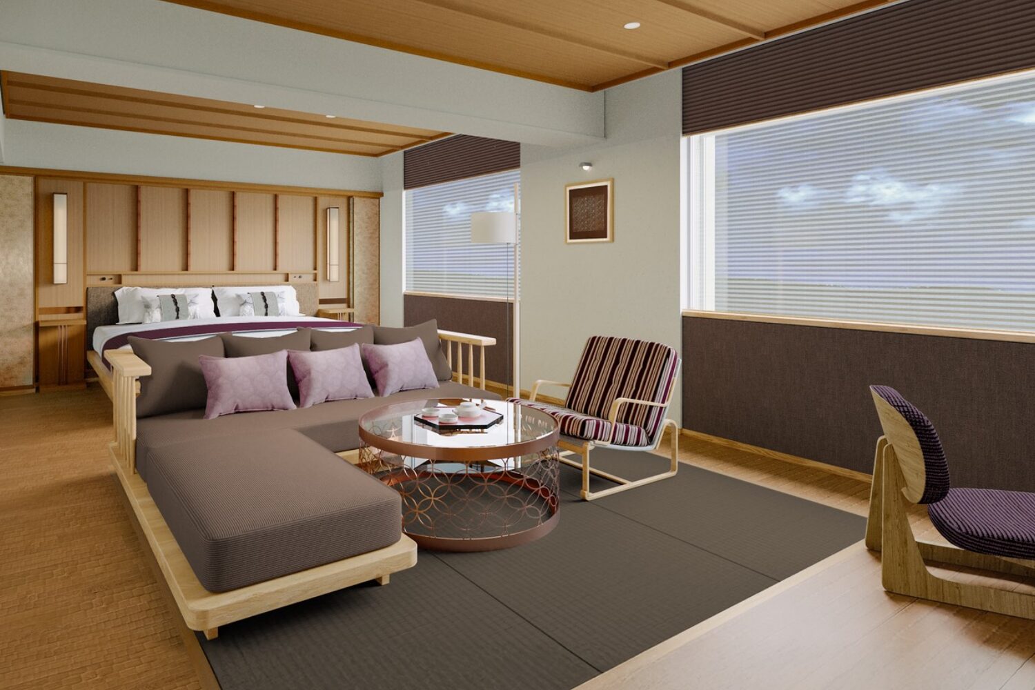 素足で寛ぐ「床座」のスタイルを大切にした京都らしい客室です。 国産天然木の縁甲と畳を組み合わせ、和の安らぎをモダンに昇華した小上がりの居間は、靴を脱いでお寛ぎいただけます。