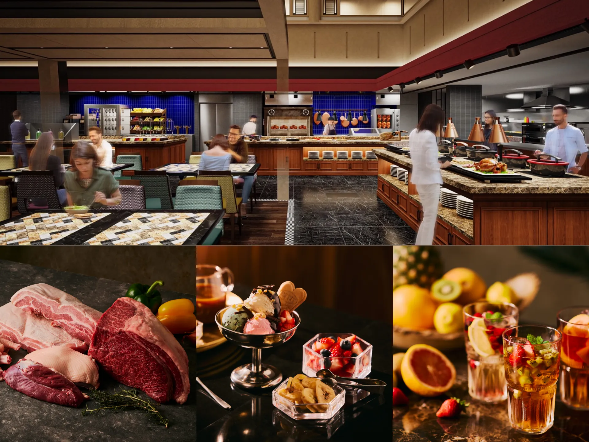 「La Jyho Live Kitchen」では、新ビュッフェ「THE THEATER BUFFET(ザ・シアター・ビュッフェ)」を通年で開催。ビュッフェエリアの目玉となるパフォーマンスコーナー「MEAT THEATER(ミートシアター)」では、ランチ・ディナーとともに和牛を使用したメニューをはじめ、多彩な調理で仕上げる肉料理が30 分間隔で登場。