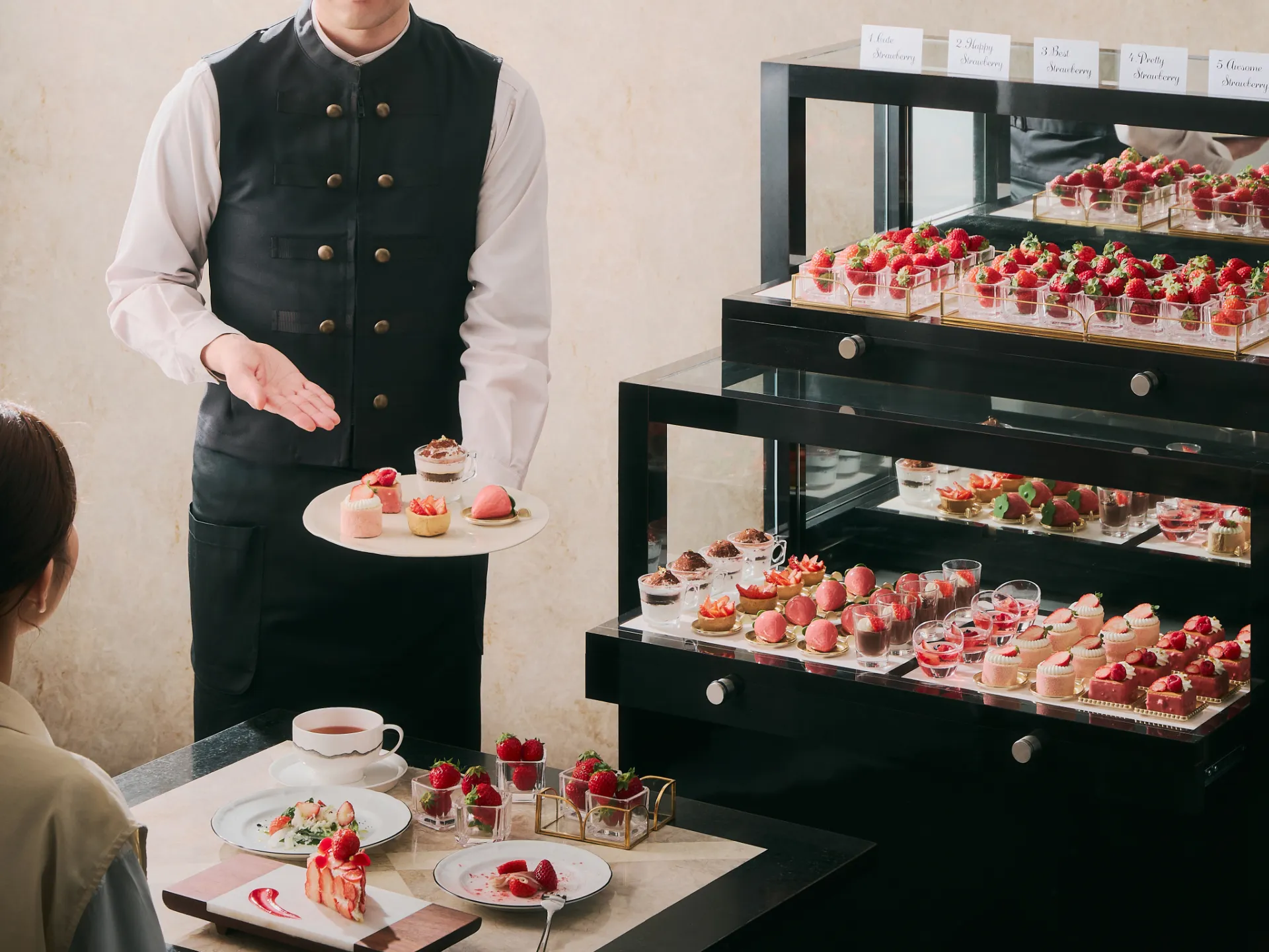 スタッフがスイーツやセイボリーをワゴンやプラッターにのせてお客様のお席までお届けするスタイルで提供、ご着席のままでお好みのメニューをゆっくりと楽しめるスイーツビュッフェです。