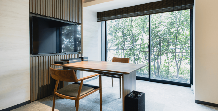 ミニマライズされることで感じる上品な空間の先には、心やすらぐ坪庭が。シンプルで清々しい客室は、眠るだけの場所ではなく、贅沢な時間を過ごせる場所です。