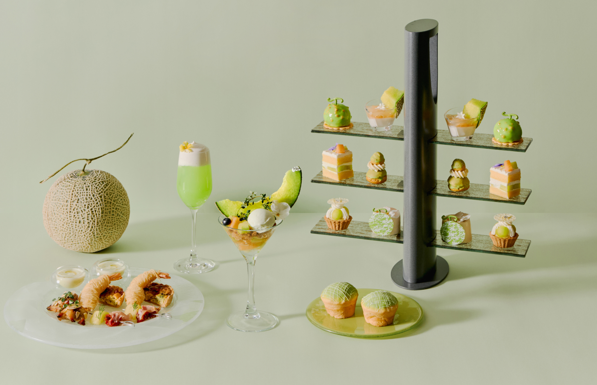 ティースタンドには、メロンの形を模したぷるんとしたフォルムが特徴の「メロンムース」や、メロンカスタードをたっぷり詰め込んだ「メロンルリジューズ」など、メロン尽くしのスイーツ 6 種が並びます。