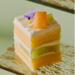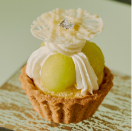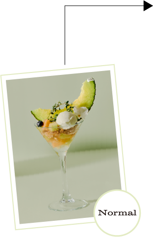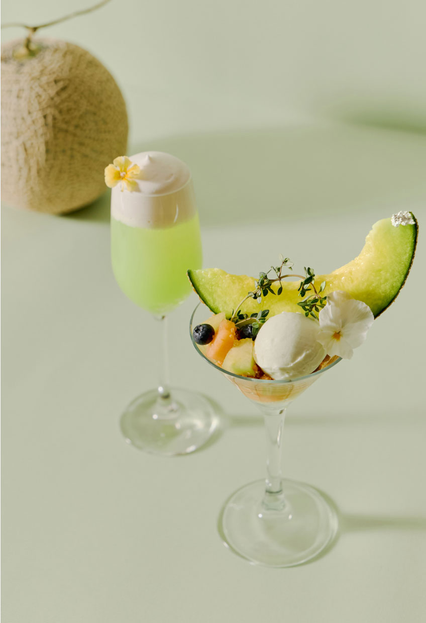 旬のフレッシュのメロンを主役に、幾重にも重なる美味しさをグラスに閉じ込めました。トップには瑞々しいメロンを大きくカットし、メロン香るミルク風味の豊かなアイスクリー ム、エディブルフラワーを添えて夏らしく華やかに。底には爽やかなサイダーゼリーを敷き詰め、後味はすっきりと仕上げました。