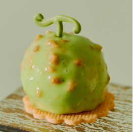 ふんわりとしたメロンパンの中に、メロンの果実味を凝縮したメロンクリームを閉じ込めました。仕上げに施したチョコレートコーティングが、心地よい食感のアクセントを添えます。